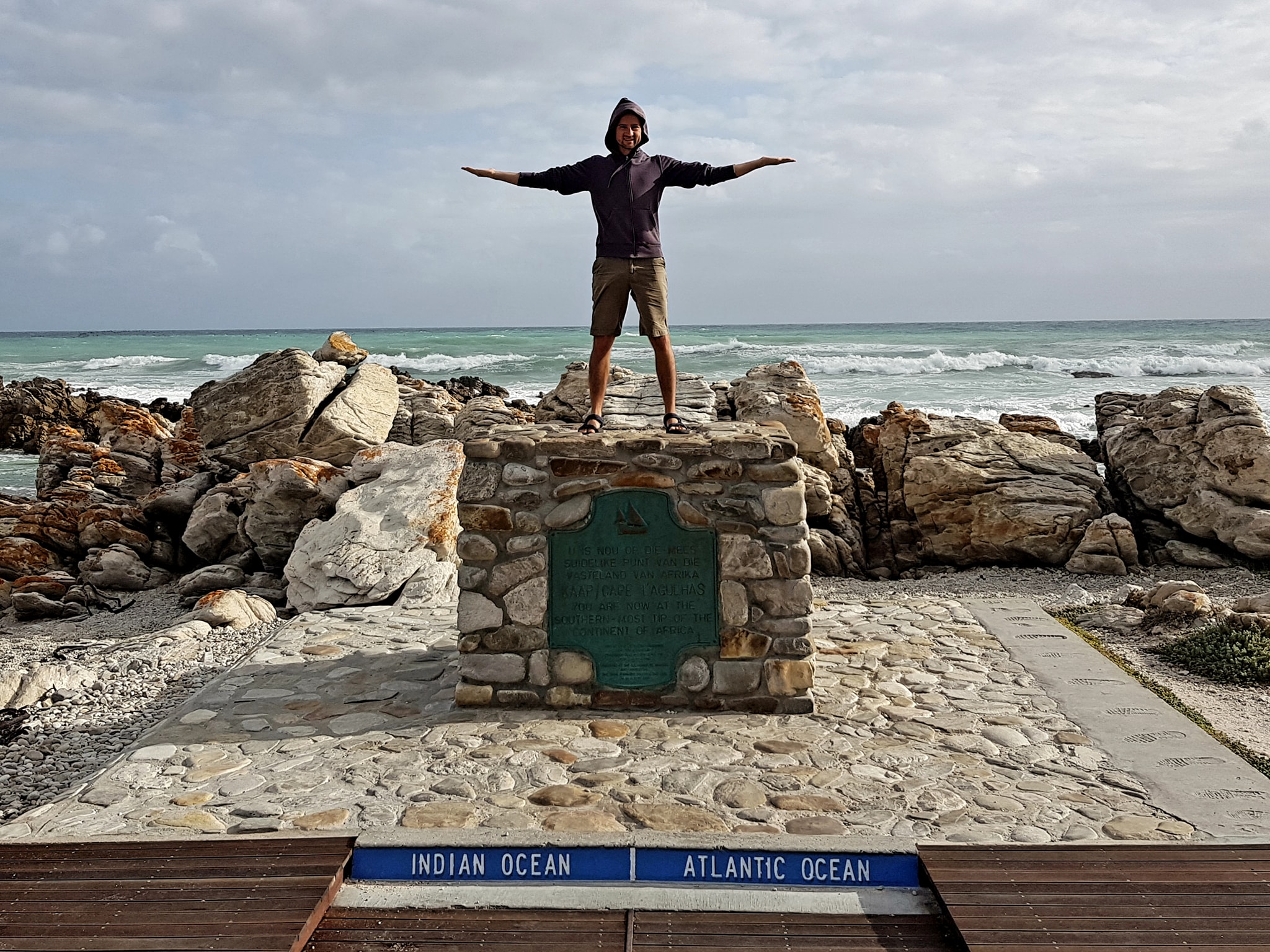 Nel pomeriggio prendiamo possesso del nostro appartamento a Bredasdorp e ci dirigiamo subito a Cape Agulhas, il punto più a Sud del continente africano, dove si dividono ed incontrano gli oceani Indiano ed Atlantico! Abbiamo trovato vento fortissimo e mare in burrasca, lo stesso clima che in passato faceva affondare tante navi in questo luogo! Nel punto preciso, oltre al monumento con la targhetta che indica dove i due oceani si dividono, ci sono: una miniatura dell’intero continente africano e il faro bianco e rosso dove si può salire (13,70R|9-17|sito web).