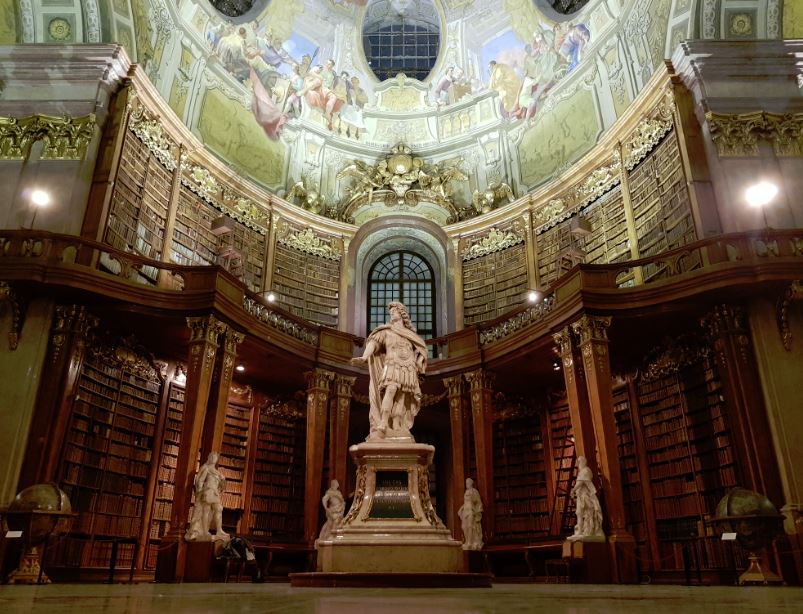 L’ultima visita spetta a quella che secondo me è la perla di Vienna: la Biblioteca Nazionale Austriaca (sito web). L’attrattiva principale è la Prunksaal, ovvero la Sala di Rappresentanza. E’ la più grande biblioteca barocca d’Europa che conserva più di 200.000 volumi antichi, molti del XV sec. Su tutte le pareti e le balconate sono poggiate librerie con grandi tomi rilegati in pelle. Si dice che qui vi sia conservata la ricetta segreta della Sachertorte.