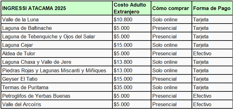 La maggior parte delle attrazioni principali del Deserto di Atacama, in particolare quelle nei pressi di San Pedro, è a pagamento da diversi anni, con una tendenza all’aumento dei costi e alla privatizzazione degli accessi che si è consolidata nell’ultimo decennio. E’ molto importante tenere a mente che alcuni degli ingressi si possono pagare solamente on-line, quindi è bene controllare i posti disponibili con un certo anticipo per non rischiare il tutto esaurito. Altre attrazioni vanno pagate fisicamente e non accettano la carta di credito, quindi è meglio portare del contante sempre con se. Ogni attrazione è gestita da un privato differente, quindi non c’è un sito internet unico dove acquistare tutti i biglietti, ma ho trovato molto utile un sito dove sono elencate tutte le attrazioni, il loro costo e il link diretto al sito d’interesse per finalizzare l’acquisto: sanpedroatacama.com. Di seguito un riepilogo di cosa si può visitare: